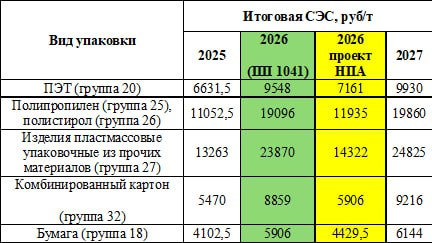 Союз переработчиков пластмасс (СПП) обращает внимание на то, что в соответствии с п. 5 протокола совещания у заместителя председателя Правительства РФ Д.Н. Патрушева от 01.10.2025 № ДП-П11-57 значения коэффициентов «неэкологичности», на который умножается базовая ставка экологического сбора, устанавливаются на 2026 год на уровне значений 2025 года, что означает, что в 2026 году по некоторым видам упаковки (весь пластик, бумага и комбинированная упаковка) итоговая ставка экосбора на 2026 год понизится по сравнению с установленными постановлением Правительства 1041 от 01.08.2024 года значениями (при этом она повысится на 8% по сравнению с итоговой ставкой, установленной на 2025 год, то есть на уровень инфляции — как и предлагал бизнес).СПП рекомендует учитывать изменения ставки экосбора в договорах с поставщиками упаковки на 2026 год.